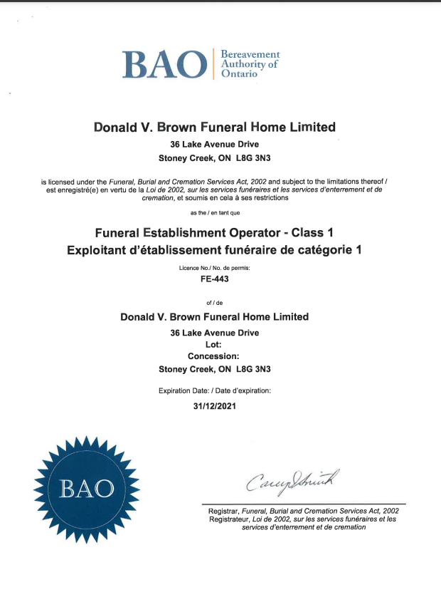Welcome to the Donald V. Brown website where you will find helpful information and insight into the services and resources offered by the staff and facilities at our location. Serving Stoney Creek, Hamilton, the Niagara region and surrounding areas since 1955. Our level of care, compassion and overall commitment in providing families with the attention and concern they require has established a tradition of trust.